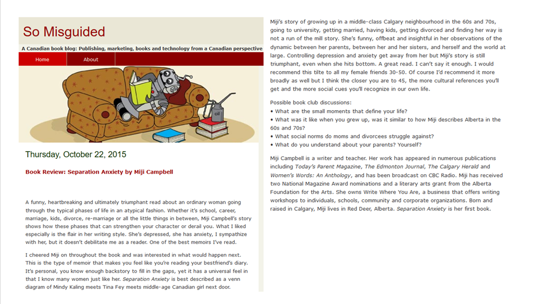Listen to the complete Separation Anxiety Book Review; CBC Radio One, “The Homestretch,” air date August 31, 2015.
