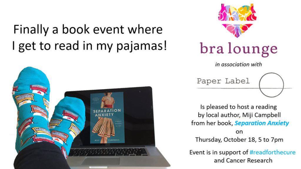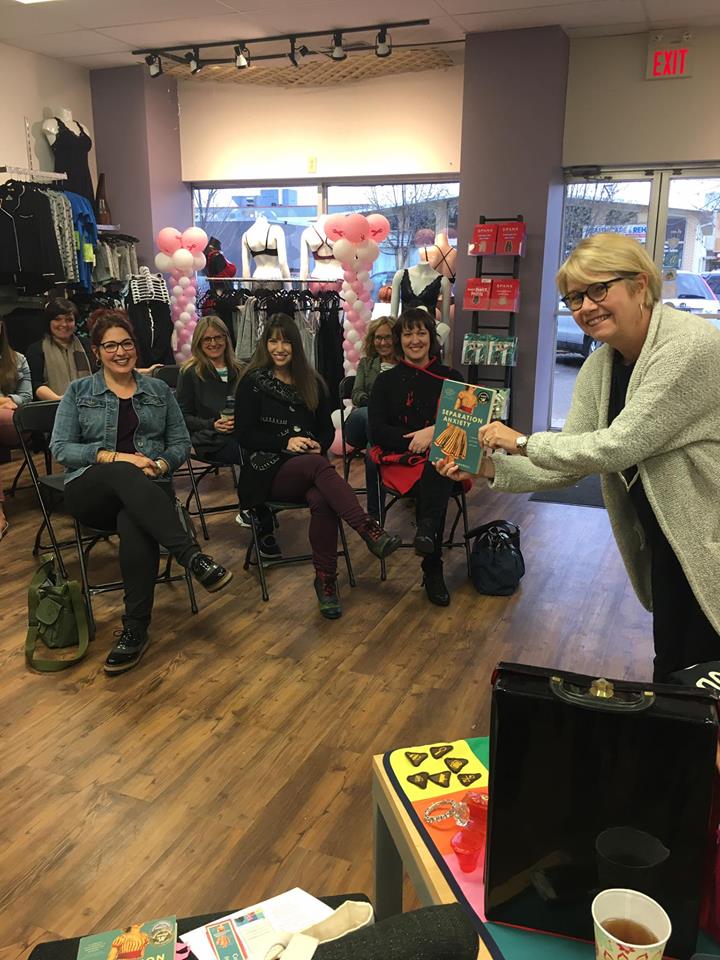 Separation Anxiety has been to bookstores, bars, and bistros but this is its first bra store. (First bra — now there’s a story.)